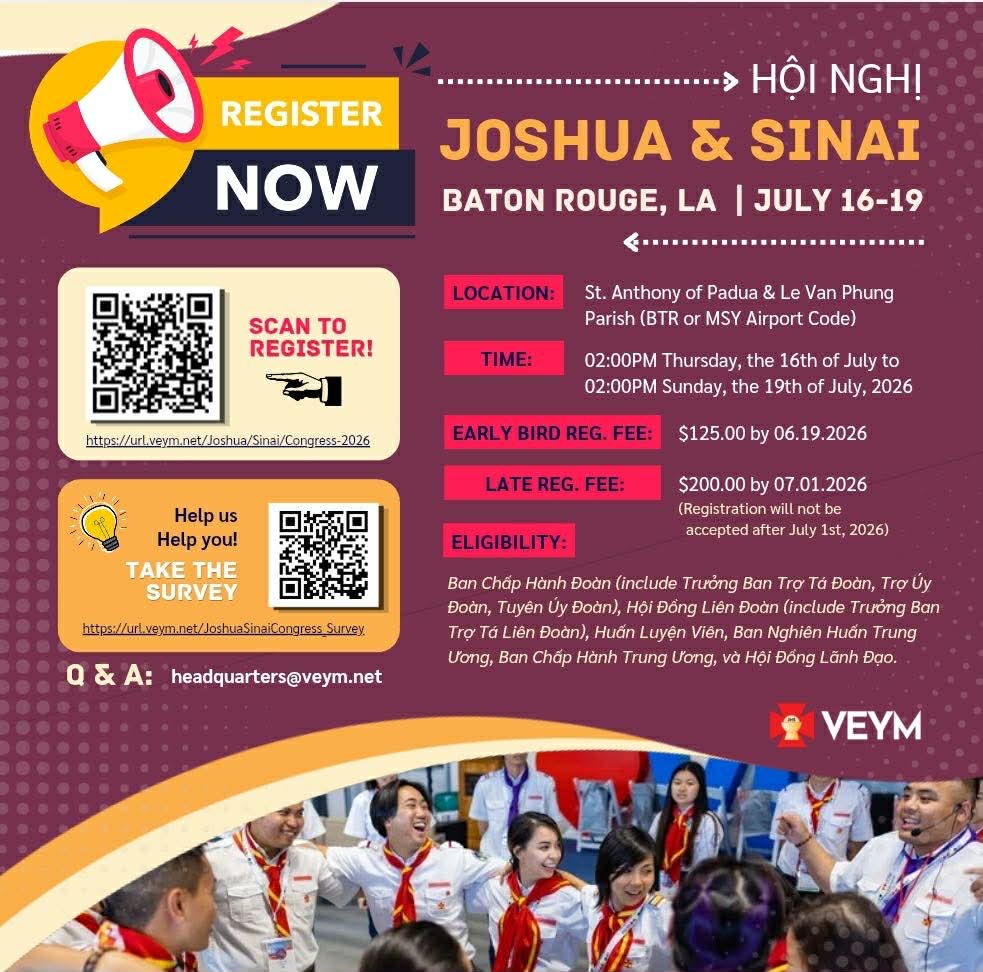 We are excited to share the VEYM’s 2026 Joshua (Ban Chấp Hành) and Sinai (Huấn Luyện Viên) Congress to commence this summer in Baton Rouge, LA. The National Executive Committee respectfully invite all eligible members to make every effort to attend this important congress for the future of our Movement. Your presence at this congress will undoubtedly reenergize the vitality of our Movement. Through dynamic keynote speakers, practical breakout sessions on effective strategies for evangelization, discussions and dialogues on VEYM transformation and advancement, social gathering, praise and worship, music, food, prizes, and much more, those in attendance without a doubt will be motivated and sent forth to lead their chapter into the next chapter in our great history.